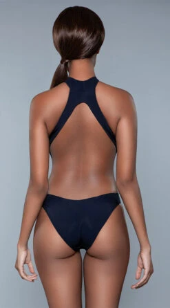 Time for a naughty dip in the pool! This provocative micro bikini features open triangle cups, strappy detailing, halter straps, O-ring accents, a tie back closure, and matching bottoms with a thong cut back.